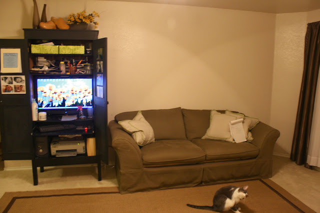 The problem was that the room felt SO off kilter with two huge pieces of furniture right next to each other ll on one side. But the problem after this is it felt like such a bare spot once removed, and because of the placement of the armoire, nothing else could really go in that spot.