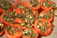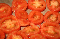 Scald these in a large saucepan for about 1 minute. Plunge into cold water and peel. Slice into 1/4 inch thick slices and place close together on a large rimmed cookie sheet (or oven proof platter)