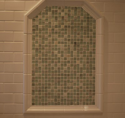 The open shower definitely adds a modern twist to the room. We installed a rainshower and a spray showerhead on a slidebar. We chose 2 x 2 honed carrara marble tile for the floor and polished carrara for the sills and threshold.