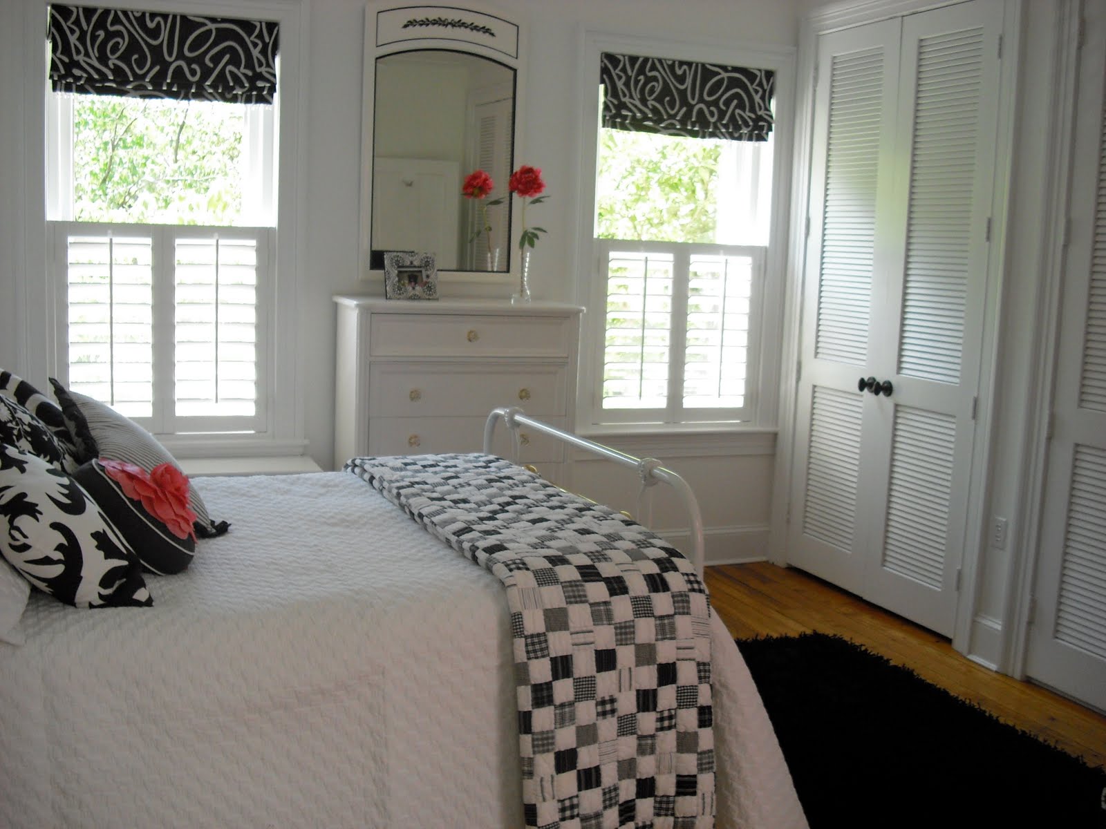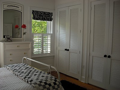 There’s a funny story to the quilt on the bed. Years ago, I decided that someday I wanted to have a black and white bedroom, with a black and white quilt. I fell in love with this quilt while I was out shopping with my mother. Even though I had no place to put it just then, I bought the quilt and figured I would have it when the time came. I stashed it at my parents’ and promptly forgot all about it. Well, fast forward about three years. I bought the house and decided that I wanted a black and white quilt (guess my taste hadn’t changed much). I started to shop around for bedding, when my mother asked if I was going to use the quilt in their attic. Good thing she remembered, or I would have gone crazy trying to find the perfect quilt that I already had!