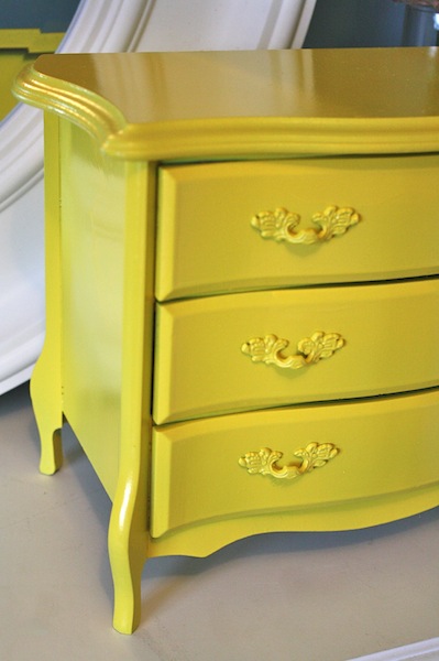 >Oh I am so in love with this! It looks so much like my own dresser, now I'll be on the hunt for one too. The blue velvet is perfect with that yellow. I bet the lucky girl who gets this will be thrilled.