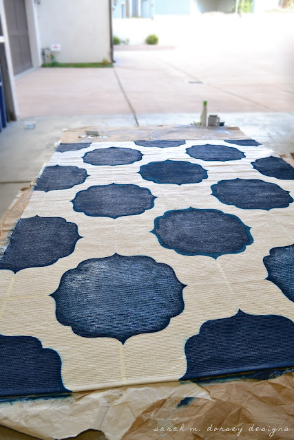 Hi Remodelaholics! I am Sarah and I blog at Sarah M. Dorsey Designs where I share every step of my DIY adventures. I am an Interior Design out of Central Coast CA. I love adding personalization to our rental through color, pattern, texture and creative design solutions! I believe that big style can be created with little $$ by repurposing thrift and big box store finds with some paint, elbow grease and tlc. I am so excited to share with you my diy Stenciled Moroccan Rug. It is one of my favorite projects, and with some time and patience you can create one too! Feel free to drop by and say hi at my blog Sarah M. Dorsey Designs, I’d love to hear from you!