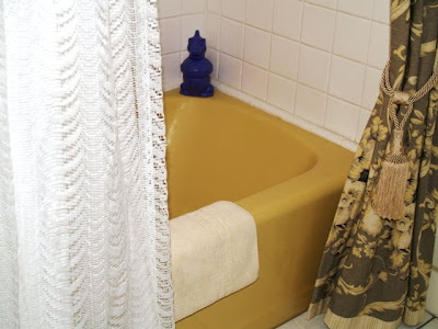 This also helped to bring down the garish tub and toilet color a notch and brought the bathroom together.