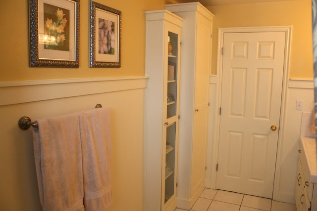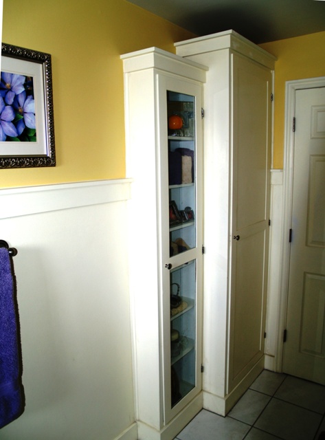 With the door moved over it allowed room for custom cabinets that add space for the bathroom towels and supplies. And by repeating the style of the wall trim on the top of the cabinets it gave a nice architectural feel.