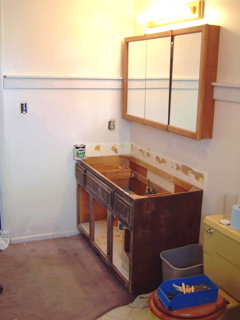 and move the toilet. The vanity cabinet was saved, stripped and repainted.