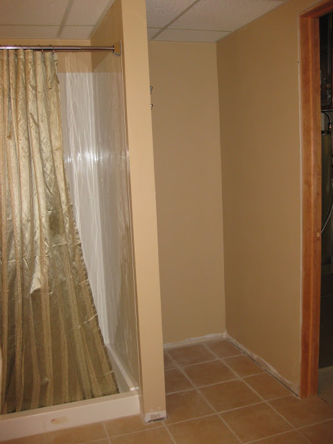So as you can see our bathroom was just beige-tastic…..and I’m SO over beige right now. I’m ready to paint every surface of beigey beige wall in our house — so I’m sure you’ll read of my distaste for this color again. I used to LOVE beige — so warm and inviting, but now I’m just ready for a change. And with our lovely oak trim and doors, it just makes our whole house look brown and blah. Ewww.