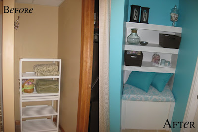 Do you LOVE it?? Isn’t it like 100 times brighter and cleaner looking? Out with that beige and in with the white! I love our little built in bench and shelves — and I can’t wait to show you how I did it. The best part is that bench opens up and I have towels and soaps and lotions stored in it. I’m all for more storage!