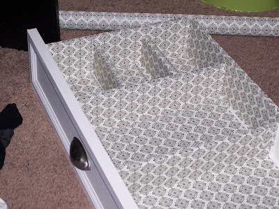 My top drawer was for my hosiery. It was snagging on the rough wood. So I used some more of my 25 cent wrapping paper that I also used on my craft desk. I used spray glue and covered the inside of the drawer.