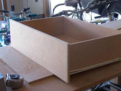 We test fit each drawer as we made them. (Word of caution leave more space than you think between drawer fronts. Once we add the trim and paint they rubbed and I had to do a lot of extra sanding and scraping.)