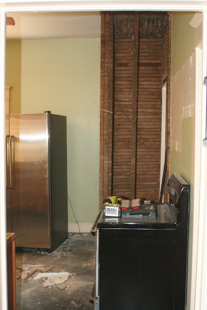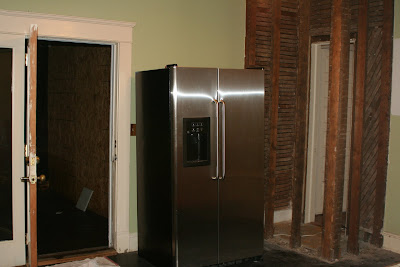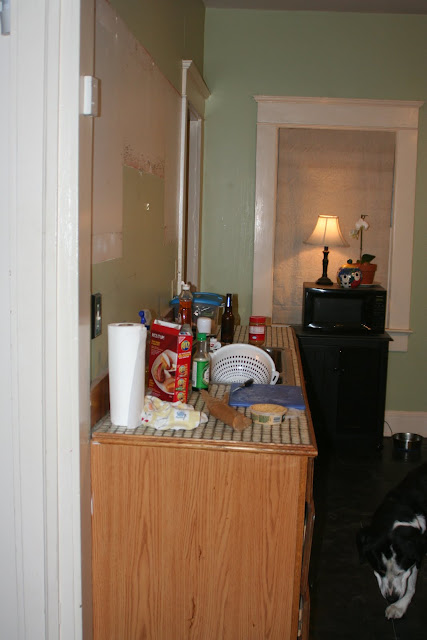 | This is what you saw when you walked down the hall and entered the kitchen. Don’t you want to go there and immediately whip up a gourmet meal? The exposed wood was the closet we ripped out from an adjoining bedroom. |