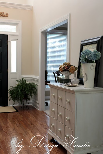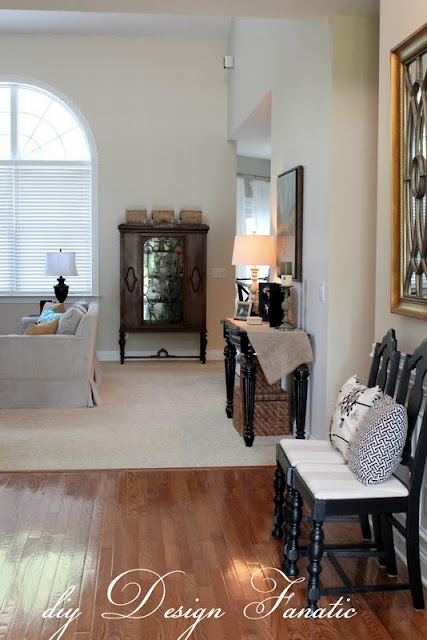 And here’s the after…stepping in from the front door… I love how the dark wood and painted furniture looks against the light paint. The large arched window seriously needs a window treatment!!!
