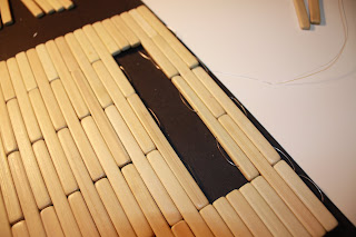 The placemats were originally woven together with a plastic string, so the first step was taking the string out without getting the bamboo pieces completely out of order. I found the end of the string, cut off the knot, and slowly removed the string. I starting moving the pieces around to create the handles and getting the right size for a clutch purse.