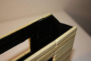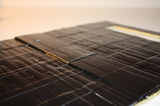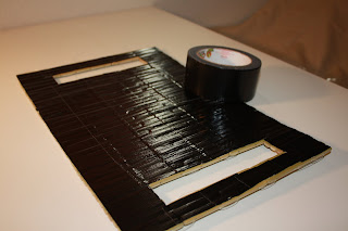 Once the pieces are locked into place you can remove the plastic string. Next I cut out a piece of cardboard for the bottom of the purse. Once the bamboo pieces are duct taped together you can pick it up like a purse and see what size to make the bottom. My purse seemed to naturally fall into a shape with 5 rows of bamboo as the bottom, so I just went with that. After it’s measured and cut, cover the cardboard with duct tape to help it blend in and to reinforce it.