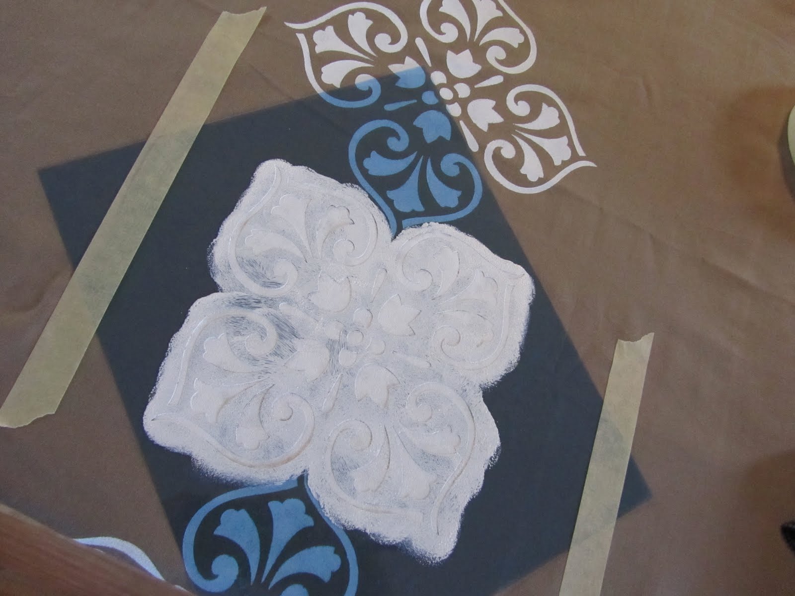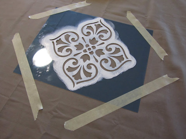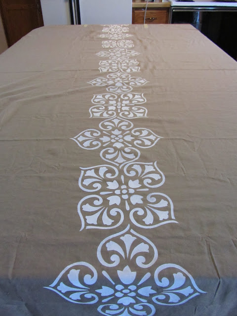 I washed and ironed my sheets and laid them out on our kitchen island. I taped the edges of the sheet to the island so that they didn’t move and slide around while I was stenciling. I decided to stencil a line of this pattern across each panel.
