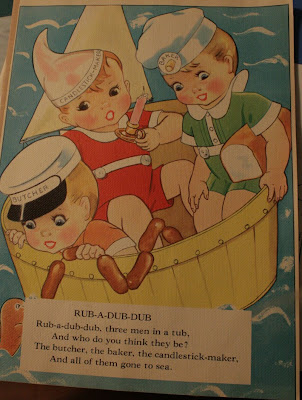 To make my design dilemma more dilemma-y, I was given something else I would like to use. While we were in Utah, Justin’s mom gave me a book from the 50’s-60’s or so(it was her mothers), of darling pictures of nursery rhymes images. So, I decided I need to work that in, so things have once again changed, and moved. Here are two little pictures from the book there are 11 in perfect condition and one sorta ruined one, I may try to salvage.