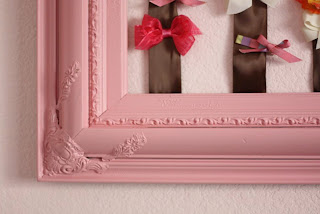 I did: cross stitch the piece on the top shelf, was given the vintage Madame Alexander Doll (I know you’re jealous), bought cheap fabric bins and tied ribbons around them (that I use to put her clothes, shoes, misc. items in), bought her curtains on clearance, found the bed set on ebay, made the bow holder out of an old frame, bought her book shelf from a thrift store, bought the rug on sale, made her hanging name on the wall, put in the hardwood flooring ourselves, and bought the frames on sale.
