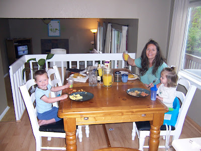 Here is the only picture of the big rectangle table I could find. This was from Mother’s Day 2009 breakfast, Mamosas and breakfast burritos (ya baby) so please excuse my all around look! It is funny to look at the stuff in the background and notice how much has changed–new mantle, tv, and layout!