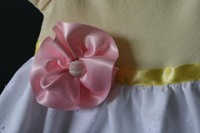 I added the yellow ribbon around the bottom and center of the dress just to clean it up. and lastly tacked on the little pink rose. And here are the final results: