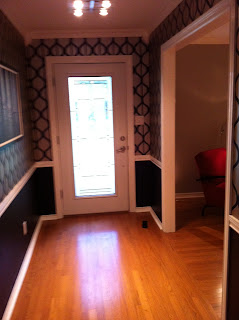 What a great way to keep a pattern in the entryway without the overpowering dark colors of the wallpaper! (And a lot easier to change if you get tired of it someday 🙂