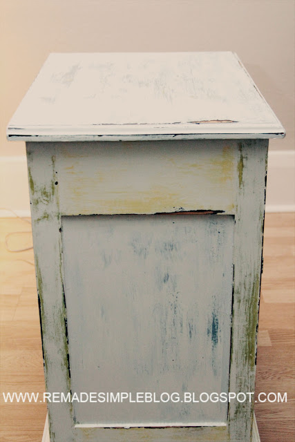 I love it. I like that you used multiple colors. I am looking to create a kitchen buffett out of an old dresser. I am going to remove a couple drawers and make that into a wine rack. Also on the door of the dresser I will cut out the center and replace with glass. I think this type of finish would be perfect. I may choose to use a black top coat instead of the white that you used. Do you think this would look ok?