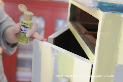 The table now has a similar effect of those expensive salvage wood pieced together tables and chests. I love how all the colors subtly show through underneath. I finished the project with a protective coating of Deco Art Acrylic Sealer. It left the table feeling as smooth as satin.