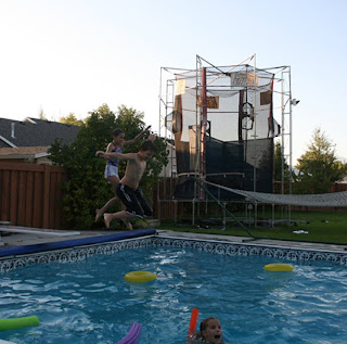 I am not kidding that this is the most fun kid house there is. Their entire basement is an arcade. They have a pool, two trampolines, a hammock and a sledding hill (which doubles as a great spot to eat potluck food). We love heading over there, and it was even more exciting because my nephew McKay got baptized (in the pool), as he just turned 8. They just moved back from Brazil, and since so much family was in town they did it here, pretty exciting.