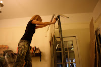 So anyway, eventually we got the lamp shade back to Williamsburg (also a hit on the crowded L train…) and I tried attaching it to the existing chandelier to see how it looked. Except I could only get it to stay on upside down, so it really just looked like a huge upside-down lamp shade hanging from the ceiling. It was actually laugh-out-loud funny looking, which made carrying it all the way home seem especially worthwhile. But- you know me- not to be deterred- I picked up a “build-your-own pendant light” kit from Home Depot the next day and went ahead and built-my-own pendant light. And I have to tell you, I am beyond happy with the results. I like the crazy circle of light that is cast onto the ceiling above the shade and in total it cost me $14.00 for the light kit and a good chunk of my ego to carry around the shade looking like a twit. Now that’s on a budget!