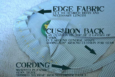 At this point I was ready to start the construction process. First, lay out the cushion back, then the cording on the edges you need it, then the edge. Make sure that the seam allowance for all three is about equal and pin together. Then just sew as closely as you can to the cording.