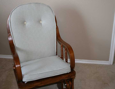 I painted the walls and ceiling about a week ago. The walls in the nursery are a tanish neutral, just like the chair was. I thought that if I recovered the chair, I could make it pop a little more, and throw in an extra pattern while I was at it. I was looking for floral, but found a houndstooth instead that was robin egg blue and white! So cute.