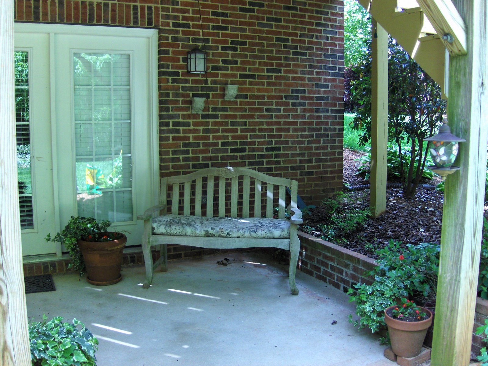 I love to sit out here in the morning, look out into the woods and listen to the birds sing.The space is the patio outside my walkout basement. It is below the deck off the main floor. The little cleyera shrubs we planted several years ago have grown up to create a little privacy on one side. On the other side of the patio, the house juts out making a little enclave; my own little sanctuary. I will miss this space most of all when we move. tear :’-(