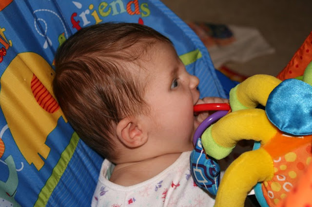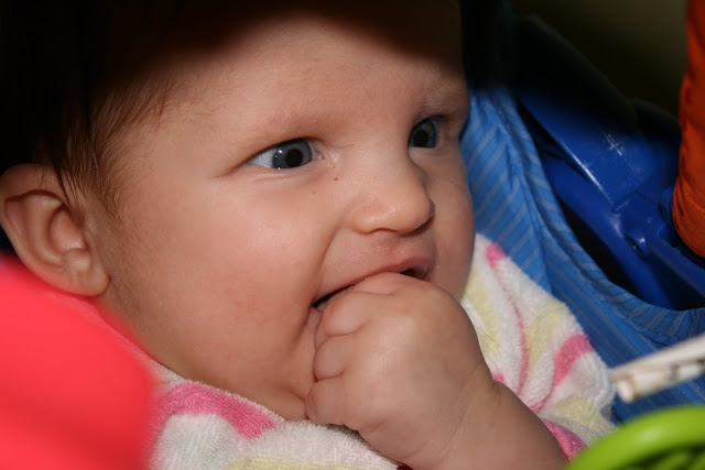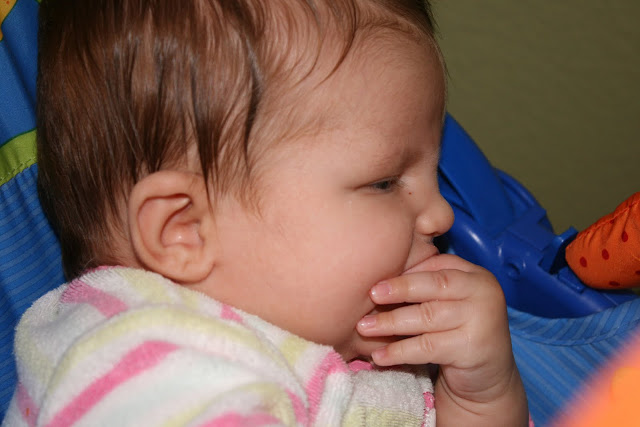 She is so into her hands. Completely fascinated with them, and will just watch them, as she holds them in front of her face and puts them into her mouth. So grown up! We are proud of you Etta Girl!