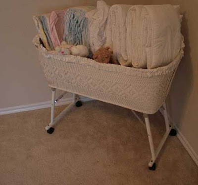 My sister Tiffany gave my this bassinet a few years ago. I am excited to finally be able to use it. I am planning on making a skirt and cover etc for it. Meanwhile, it is holding toys and the crib bedding that Tiff also gave me. I have two sets, both adorable, So, we will see which one we use at least this time around!
