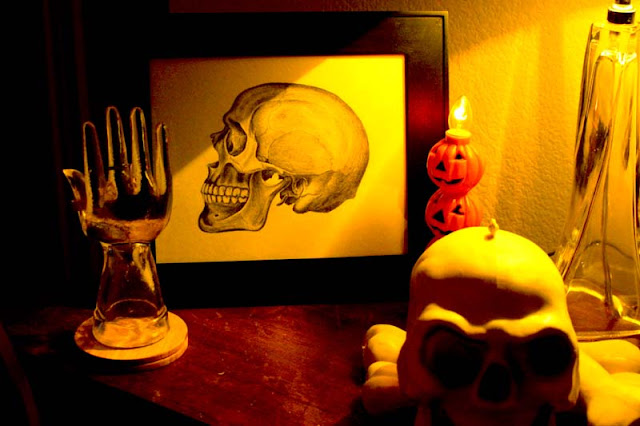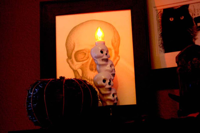I know, I already showed you some decor ideas from other sites. But, I thought I would take some pictures of our own stuff. I had a lot of fun taking some spooky pictures in the dark! The of the decorations I was most excited about are the skeleton pictures. Justin drew them back in high school for an art class. I was looking through his old portfolio work and found them and knew they must be used! What do you think?