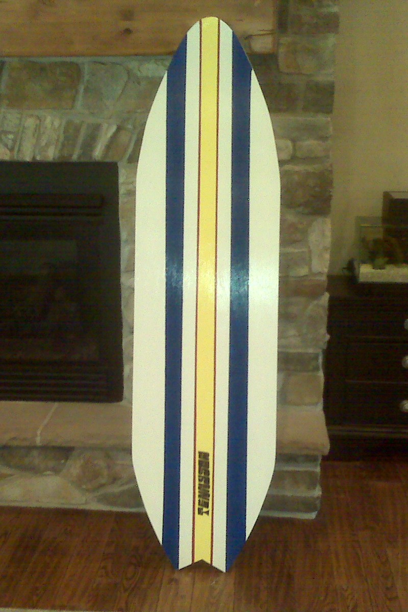 Now it’s time to paint on the name, which could be a surf board brand OR I used the last name of the family who the surfboard was for. I usually free-hand it, but if you’re not comfortable doing that, find a font you like and print the text off your computer. Turn the paper over and scribble all over the reverse side of the paper where the text is. Line up the paper where you want the letters to appear on the surfboard. Take a pencil and outline the letters. This will create a faint outline of your text on the surfboard. Now paint in the letters.