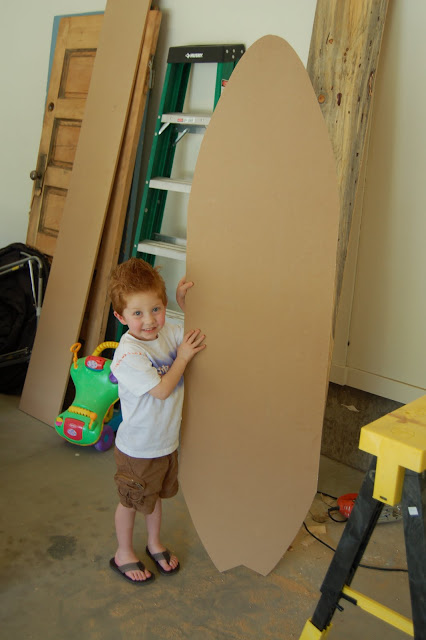 To make this towel rack you will need a large sheet of MDF. I purchased a sheet that was 4’x8′ and a half inch thick. (You’ll have extra MDF for another project.) I think the easiest way to get the surf board shape is to cut one long strip first so it’s still 6′ long, but about 2′ wide. (Usually they will cut make a few basic cuts for you at no cost at the Depot.) Then sketch out a surfboard shape and cut it out. Sand the edges. (Find a cute nephew to model the cut board.)