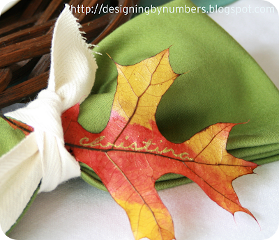 Why, I have some of those glass candle holders/coasters that I could put a leaf underneath, what a neat idea! I too use real leaves on the table and as place cards each year. It’s one of those activities that I use to keep little guests occupied. They get to go out and “hunt” for the most beautiful leaves and then I give them markers and ask them to write the names in their prettiest cursive writing. The leaves are so pretty and the kids so proud of their creations and contributions!