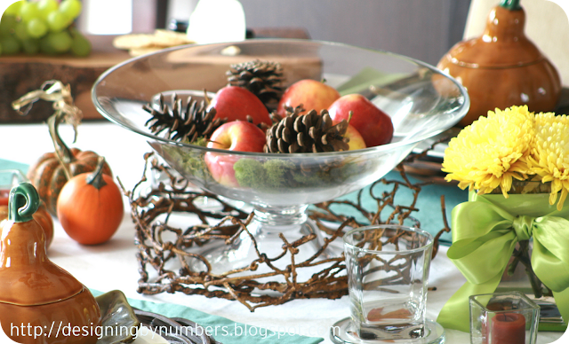 First thing’s first, you’ve just got to get a centerpiece together. For my natural focal point, I grabbed a large bowl and arranged some apples, pine cones, and moss inside and jazzed it up a bit with some faux branches around the base. Having just made a trip to the pumpkin patch (that morning!) I added a few mini pumpkins to the display. Some bright yellow flowers embellished with a bright green satin bow added a real pop to the table.