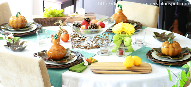 I love the fall colors and decor with the aqua-turquoise colored placements…it really gives it a fresh pop of color. Sometimes, I think autumn/thanksgiving decor can be really heavy looking, but this still has a nice, fresh, playful look to it. I think it’s great. (I would never have the patience to cut butter into shapes…very impressive!)