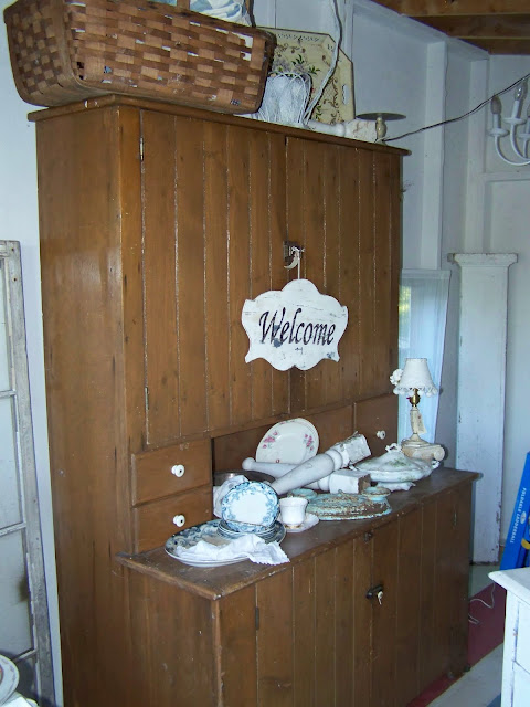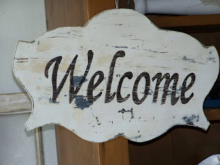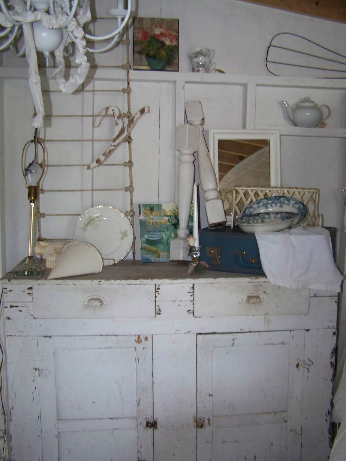 >Oh, this turned out so good…you've got a great Shabby Chic theme going here….that big wonderful natural wood cabinet with the Welcome sign would be fabulous painted creamy white!