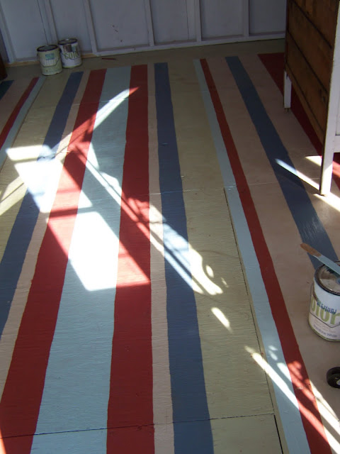Don’t you just love them! I even let my kids help me paint a few stripes. I painted a border of the green all around the whole room 16×20. Then I painted stripes of dark blue, burgundy, tan, green and light blue on the inside to make it look like a rug.
