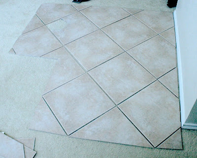 To begin laying the tile, I chose to dry fit it all. Mostly because the bath is on the second floor and I knew the thinset would be dry with all the upstairs/downstairs running around. And I am a Mommy (yeah!), so this was going on in between playing, naps and feeding the wee babe!