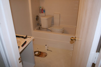 Luckily, there were no scary surprises when we ripped up the floor. This actually gets me in the mood to reminisce on our first house in Utah (I may post some flash back remodel projects, what do you think?). Anyway, when we went to replace the flooring and had ripped out the old stuff, we found that out that the only thing holding up the floor was the plumbing! At least, we didn’t find that out by falling through at 3:00 in the morning while half asleep!