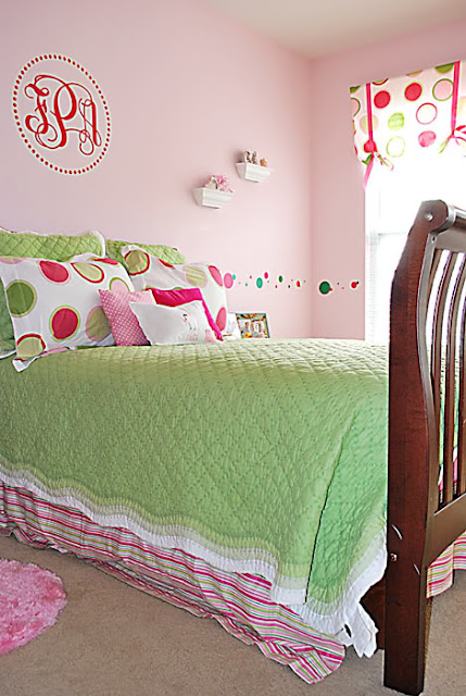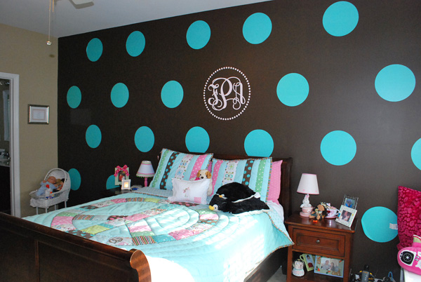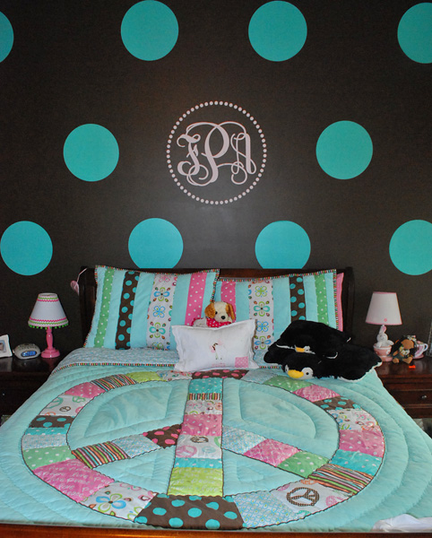 Check out how polka dots on the walls can make the perfect tween bedroom! An amazingly adorable idea that a 9 year old and mom can both agree on! Also check out that ultra cute “peace” bedspread!
