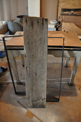 Then I attached my bases to the barnboard plank. I used a framers square to make sure It was square to the edges and not to the uneven ends.