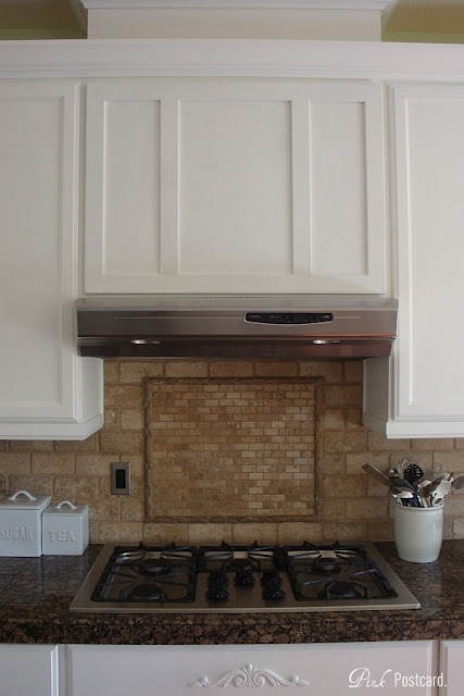 We also built a new front above the hood. Previously, there were two cabinet doors here. It was always a head scratcher why the builder did this since there is zero storage! We used a 3/4 piece of MDF, and trimmed it out- it now has the same look as our fireplace mantel that we did in the same way.